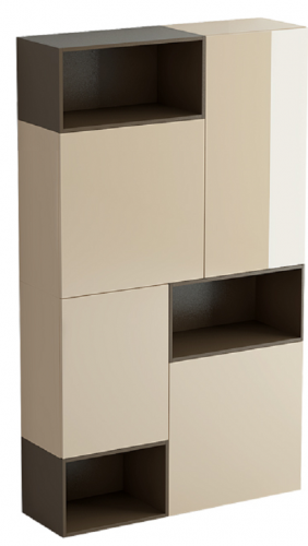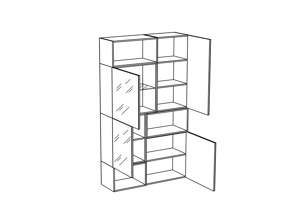 Шкаф состоит из комбинации четырех отделений с распашными дверями и трёх ниш. Все отделения оборудованы полками. Двери шкафа открываются по принципу «нажал-открыл». Шкаф установлен на ножки с возможностью регулировки по высоте.
