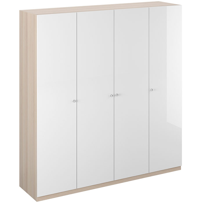 Шкаф четырехдверный состоит их трёх отделений. В отделениях расположены верхние стационарные и нижние съемные полки. Шкаф установлен на регулируемые опоры. Данную мебель рекомендуется крепить к стене. Ручки и внутренние элементы продаются отдельно.